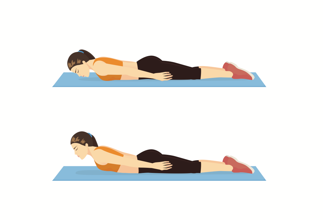 Lay on your stomach and lift your upper body. Keep your feet on the ground at all times and do a light lift with your lumbar spine. Look down and let the neck follow the spine.