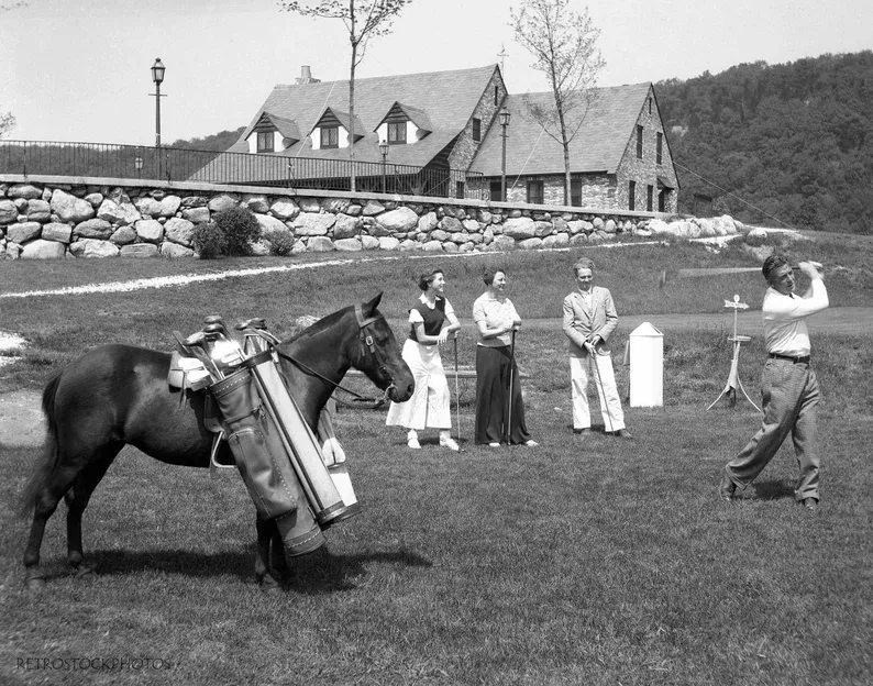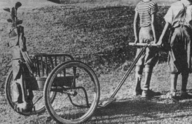 Horses are used to carry golf bags. A cheap and practical option as the only cost was hay. The problem with horses is their tendency to walk off and they made it challenging to keep a good pace on the golf course.